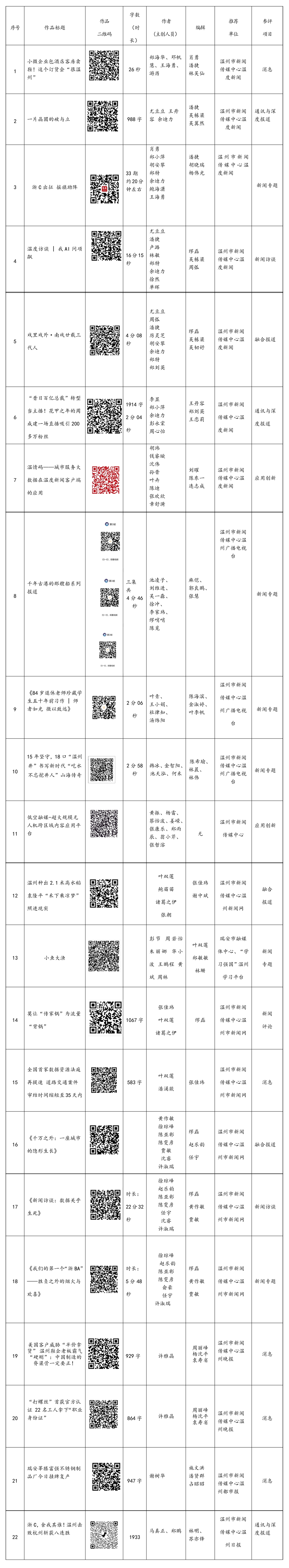 由温州市新闻工作者协会主办的2025年度温州市新闻奖评选工作已于3月10日结束。根据评选办法规定,现将本届上报浙江推荐参评中国新闻奖以下奖项参评作品及作者名单在温州记协网进行公示,公示日期为3月10日-3月15日,欢迎公众监督。
